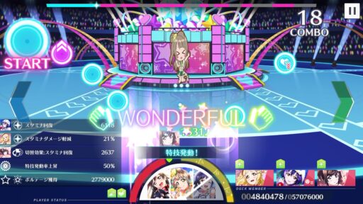 その後のACが終わると、特技発動率上昇がくるので踏んだらとりあえずGd作戦に切り替え割合ダメージを乗り越えます。乗り越えた後、アピール減少ノーツが来るのでそのままにしていた方が楽かもしれません。