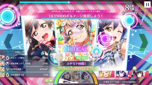 そしてここを越えると回復ノーツがぽんぽん降ってくるところへ入ります。助かりますがVoタイプでないと回復してくれません。ケチです。